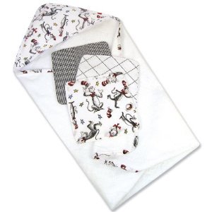 Trend Lab's Gift Cake is the perfect shower centerpiece and a practical gift for any mom to be. Gift set contains one hooded towel and three wash cloths. Hooded towel is white terry with black, red, blue and yellow Dr. Seuss Cat in the Hat scatter print on the hood and trim. Wash cloths each have fun, modern printed cotton on the front with terry on the back. Wash cloth patterns include: black, red, blue and yellow Cat in the Hat scatter print, black diamond print on a crisp white background and black and white gingham seersucker. Hooded towel measures 32" x 30" and wash cloths 8" x 8". Hooded towel is wrapped around all three wash cloths to resemble a cake with topper and packaged in clear cellophane with ribbon and gift tag.