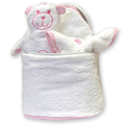 White terry velour with pink gingham seersucker trim oval 4 piece bath bag sets include hooded towel, wash cloth, bath mitt in a PVC lined oval bath bag with zippered closure.