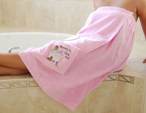 This soft terrycloth bath wrap makes a wonderful gift for mommy. The bottom of this pink wrap is embroidered with charming artwork and the words "Mommy's Time Out." The bath wrap measures 34" x 30-67".