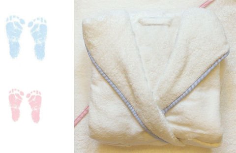 Surround your baby in softness with our special hooded robes and towels constructed of 100% pure cotton. Robes feature a snuggly velour exterior and absorbent terry interior, and are pre-washed, preshrunk and lint-free. Colors include white with blue trim and white with pink trim. The White Pique style is constructed of double-faced, 100% pure cotton terry.